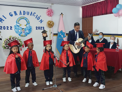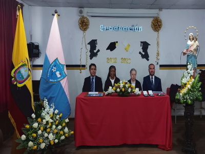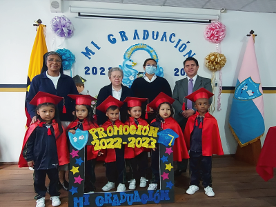 Promoción del subnivel inicial con las autoridades de la Institución, desde la izquierda: Inspectora General, Madre Superiora Agustina Recoleta, Coordinadora del DECE, Rector.